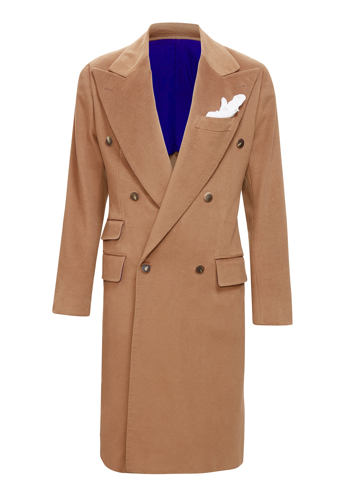 The Glencoe Coat is a double-breasted peak lapel overcoat that exudes effortless class. The fabric, the length and the subtle details are indicators that the person who chooses to wear this garment cares about investing in their wardrobe. Worn casually, formally or in uniform, the Glencoe Coat is a statement piece. The coat features a cashmere camel tone with an over exaggerated wide peak lapel, so wide that a pocket is sewn into the lapel to ensure the function of a pocket square. The pleated shoulder is slightly roped as a nod to Neapolitan tailoring. Other standout details include the suede under collar, buffalo buttons and purple silk lining. The Glencoe coat offers modern details on a classic silhouette.